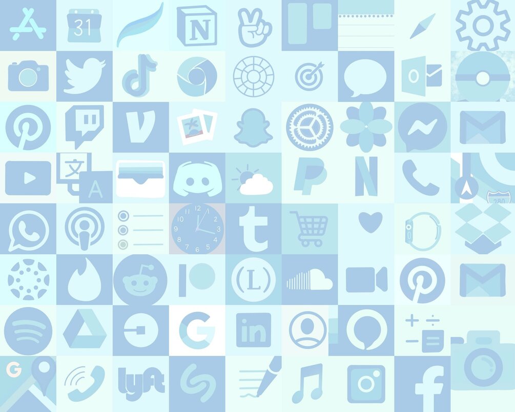 Aesthetic hand-illustrated set of 70+ blue app icons for your iOS 14 home screen.